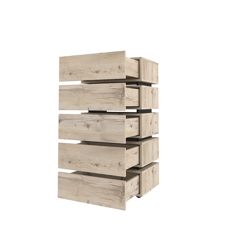 Для маленькой гостиной отлично подойдет высокий и узкий комод Nature 6. Гладкие фасады ящиков в теплом декоре Гаскон Пайн с контрастными черными боковыми планками снизу делают его по-настоящему особенным. Пять выдвижных ящиков глубиной 14 см способны вместить все необходимое, а компактная конструкция сэкономит место в комнате. Ящики легко открываются за свес. Регулируемые опоры компенсируют незначительные неровности пола.