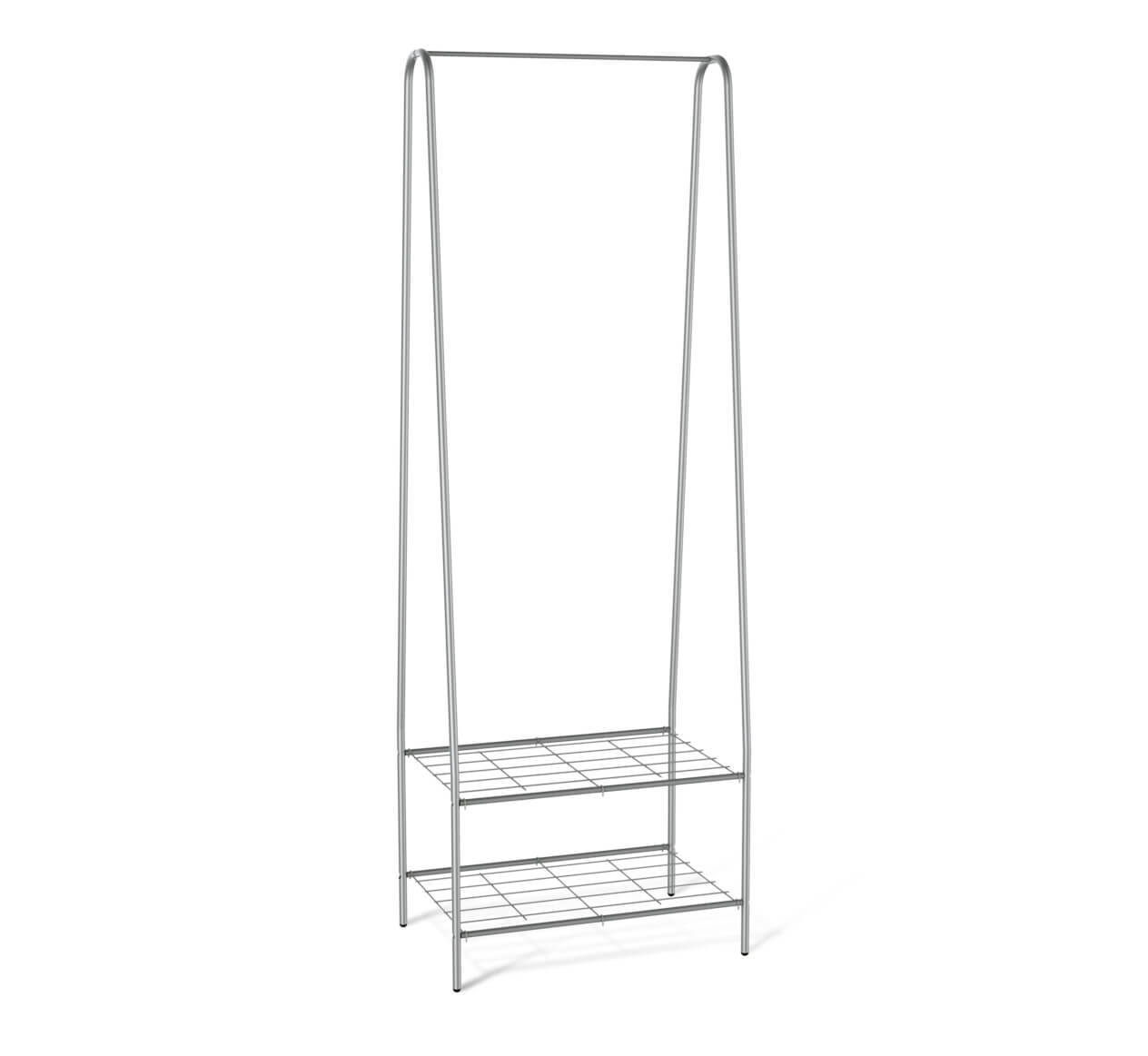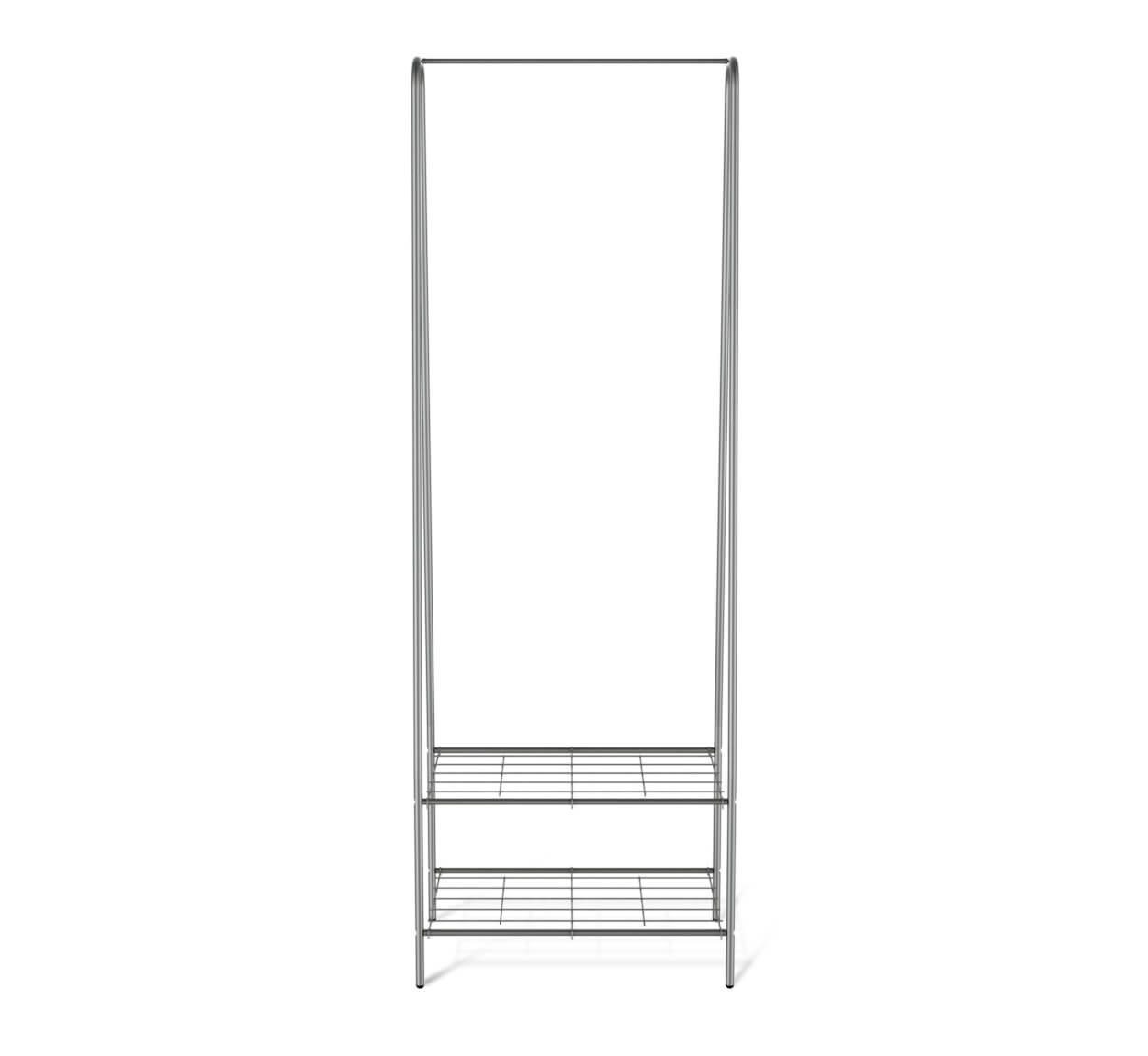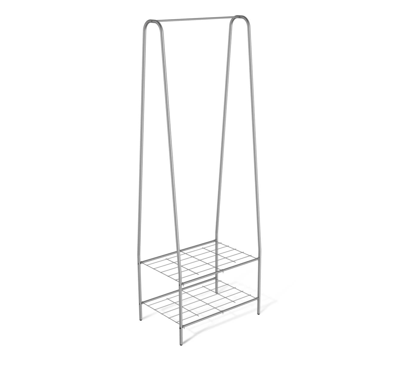 Конструкция включает в себя подставку для обуви, полку для аксессуаров и штангу для вешал. А опоры с колесиками позволяют с максимальным удобством перемещать вешалку по полу.